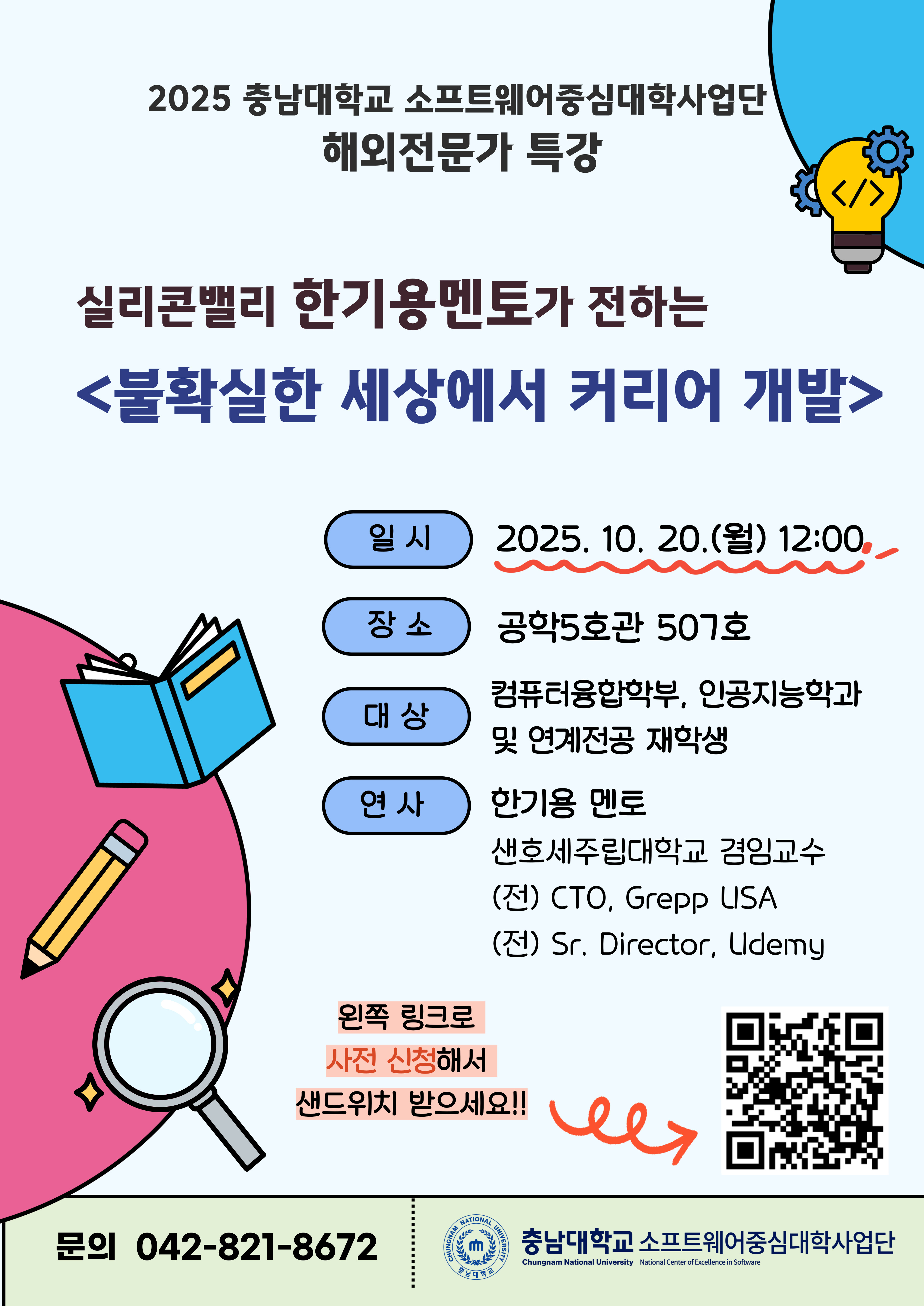 소프트웨어중심대학사업단에서 안내 드립니다. 해외 전문가 특강이 다음과 같이 운영될 예정이오니 관심 있는 학생들의 많은 신청 바랍니다. ※선착순 50명에 한하여 점심 샌드위치 제공※ - 신청 링크: https://forms.gle/6EscerZKUywVWagT6 문의 042-821-8672 또는 yeonce@cnu.ac.kr |